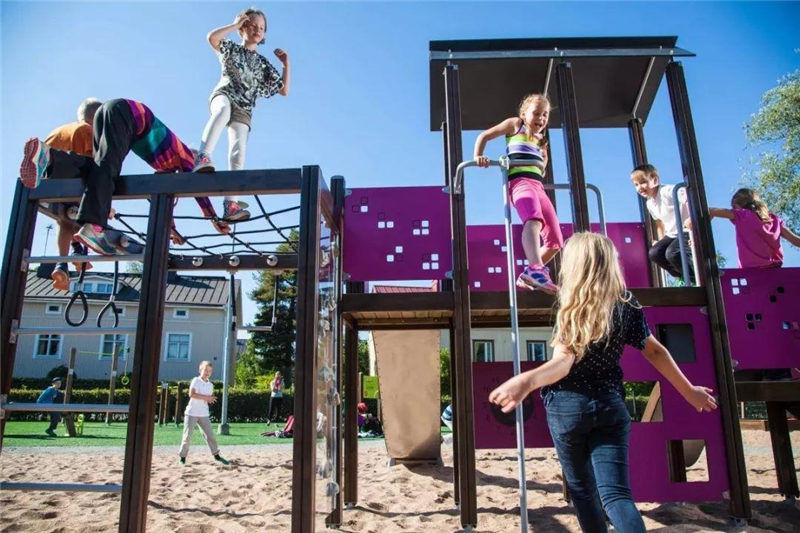 通過遊樂設備串聯起一個豐富多彩的趣味運動空間及康樂運動空間,形成一個親子互娛的空間典範,小孩子可以在大人的照看下盡情玩樂,徜徉在自然生態的環境中。靈動曲線的地形使得功能與形式出色結合,攀爬網、攀援繩、蹦網、鑽洞豐富孩子們的遊玩體驗。